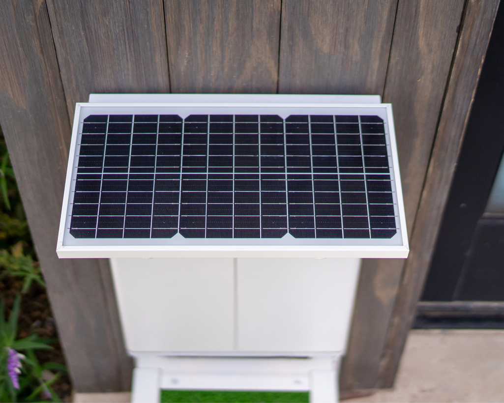 The all-metal, weatherproof Solar Panel provides 15W of converted power to the Pawport battery pack (if installed), allowing for extended battery life in suitable locations. The panel mounts either directly over the Pawport Outdoor Pet Door using the optional Solar Panel Bracket (and provides additional rain and shade protection), or on a wall or ground stake via use of the optional Solar Wall Mount and extension cable.